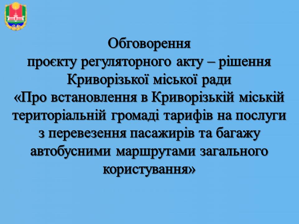 Обговорення проєкту регуляторного акта рішення виконкому міської ради «Про встановлення в Криворізькій міській територіальній громаді тарифів на послуги з перевезення пасажирів та багажу автобусними маршрутами загального користування» та аналіз його регуляторного впливу.